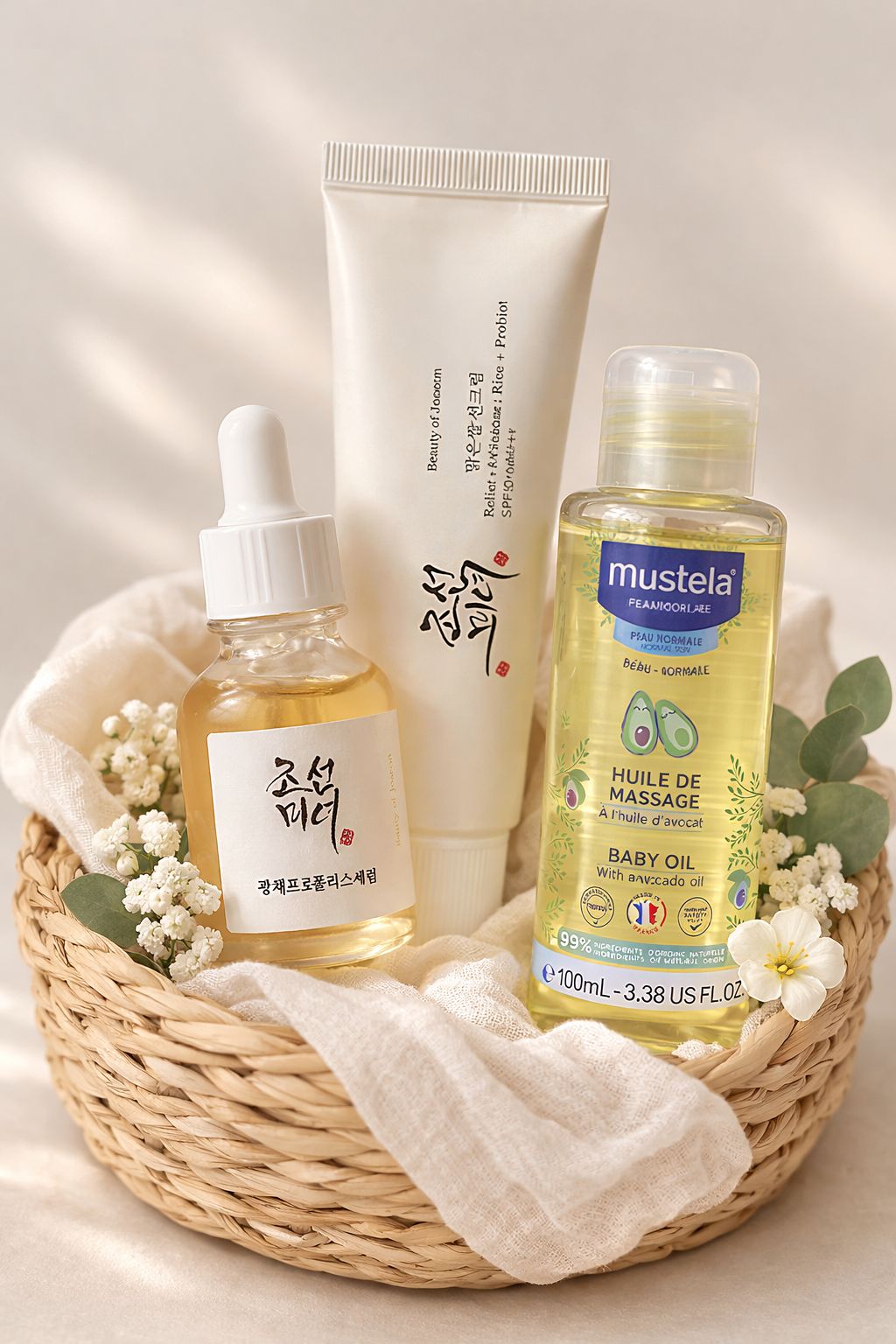This basket is a "Multi-User Power Kit," functioning as a curated collection of skincare specialists for different members of a household. Rather than a single routine for one person, it acts as a cross-generational toolkit addressing the specific, high-priority needs of both adults and infants.